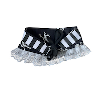 This chunky layered choker is a hand-made item by Pretty Disturbia, perfect to accessorise any outfit for day or night! Fastened with cotton ties to fit. The choker includes a skull print base, striped panel and D ring to finish off, with decorative lace also.