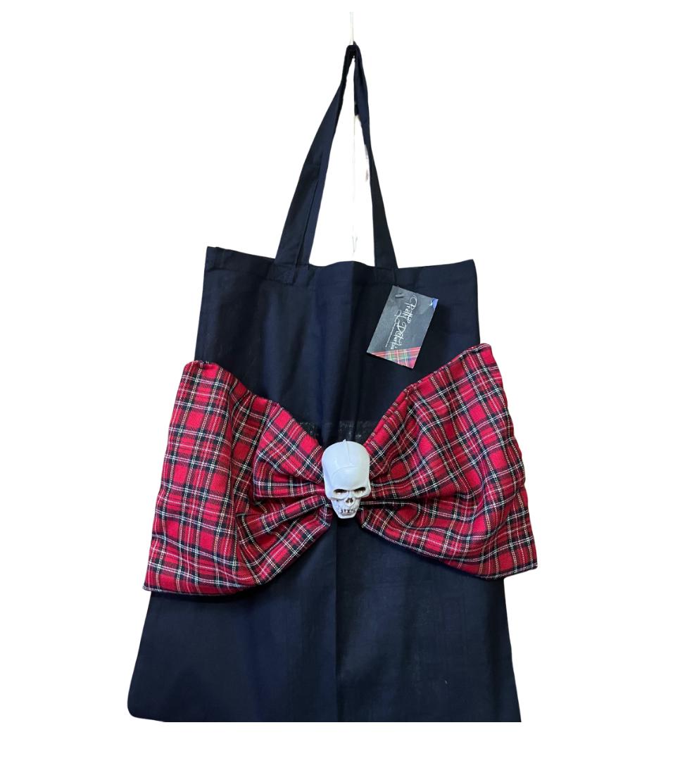 DETAILS: This gorgeous alt black tote bag has features large, handmade, red tartan bow with skull centerpiece. A perfect addition to any outfit!